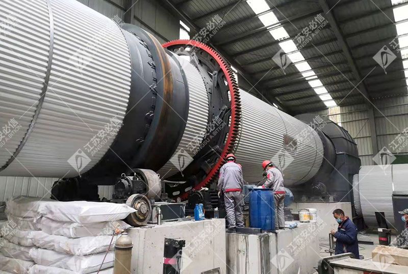 (2)選用混熱式回轉(zhuǎn)烘干機,前端熱風外加熱筒體,間接傳導烘干,濕物與筒體接觸部分水分迅速蒸發(fā),有效防止粘壁;